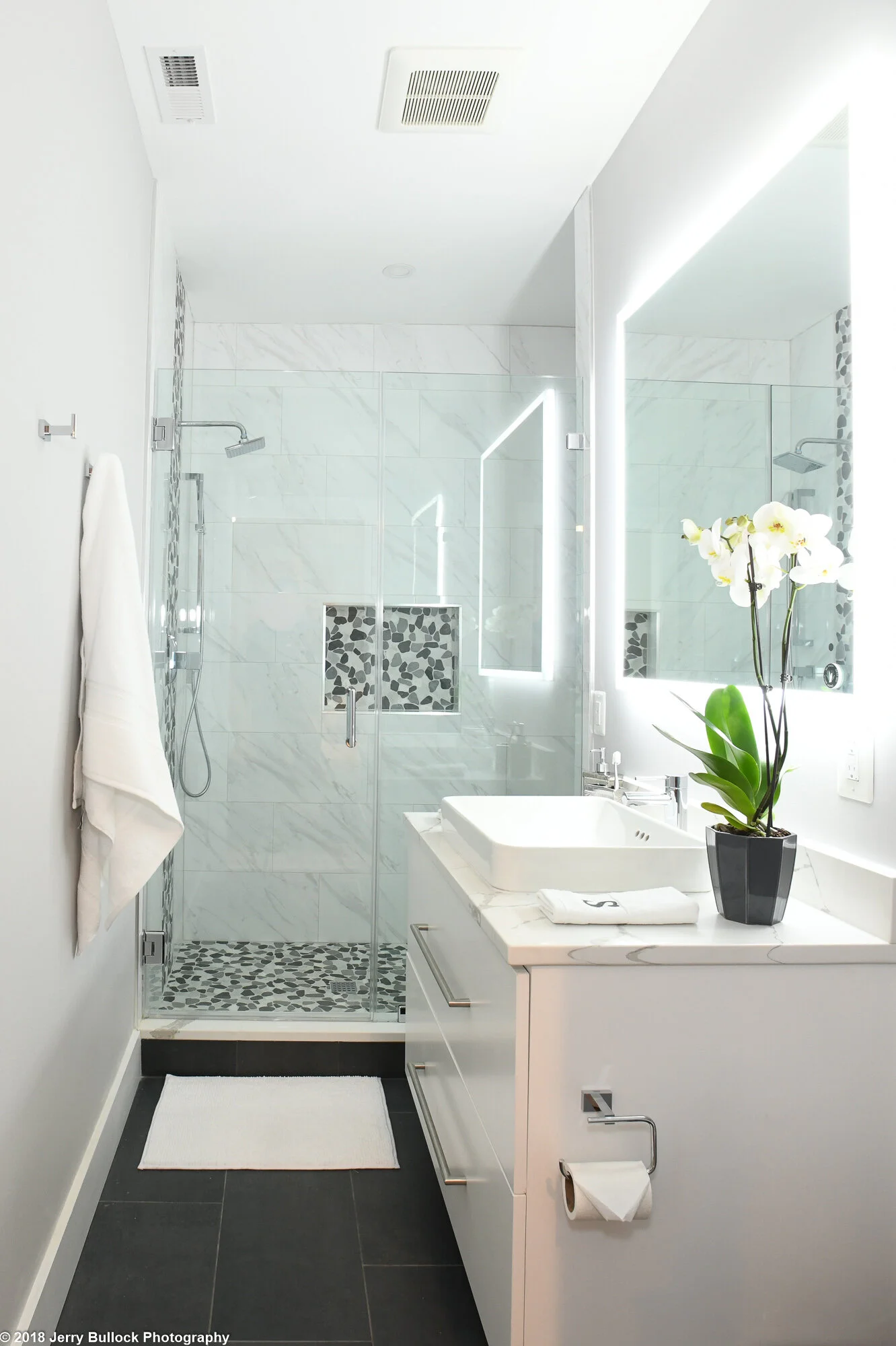The contemporary owners bathroom, while compact, provided enough space for a custom shower with build in seating. Visually the vanity was wall hung to provide the illusion of more space and a LED lit mirror adds an additional layer for task lighting. The homeowners desired to pay homage to the home’s vintage roots and previous owner with a traditional design aesthetic in the hall bathroom. A dark wood traditional vanity, mirror, basket weave black and white tile marble flooring, and a storage niche featuring a floral mosaic pattern honored this request.